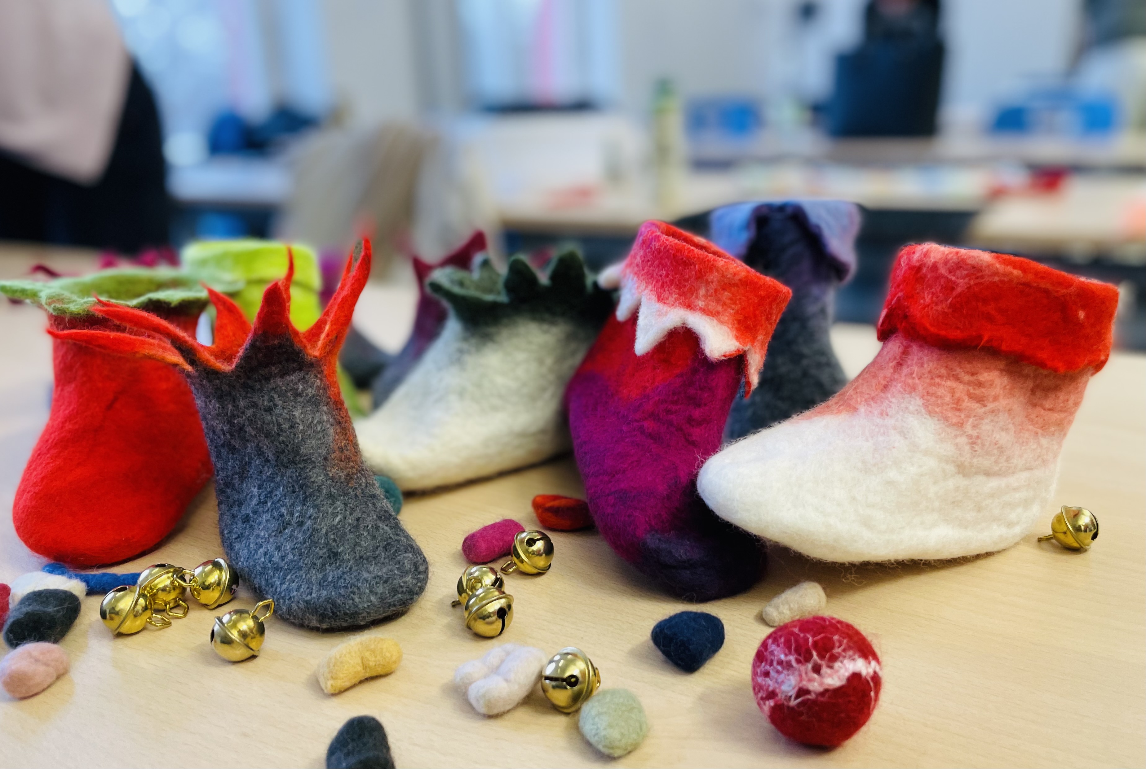 Anlässlich des bevorstehenden Nikolaustags filzten die Studierenden im Unterricht farbenfrohe Stiefel aus Wolle – jedes Stück ein individuelles Unikat.